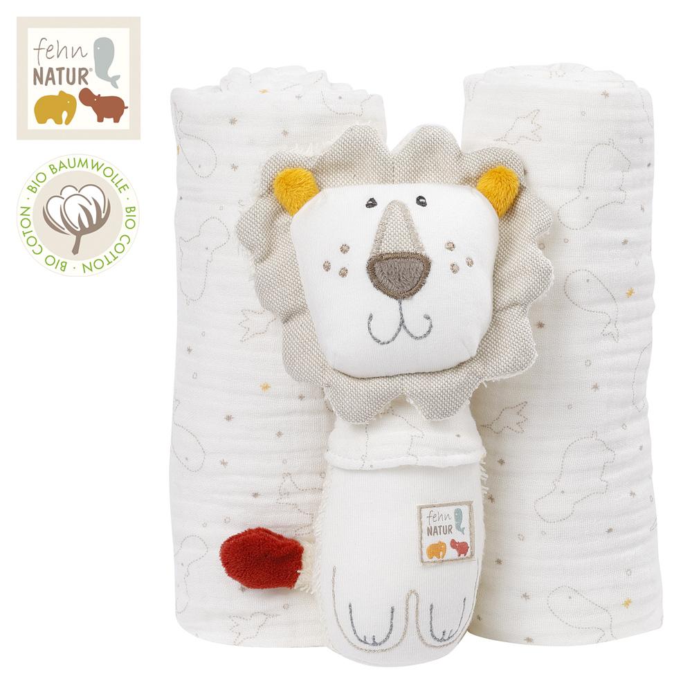 Il leone che suona e i due panni in mussola della collezione fehnNATUR formano un set regalo perfetto per la nascita del bambino. Il leone è perfetto per le manine dei bambini, suscita la curiosità del bambino con il sonaglio nascosto e invita a giocare, afferrare e scoprire. I due grandi panni in mussola misurano 60 x 60 cm e sono ottimi aiutanti quotidiani. Possono essere usati come panni antirigurgito, trapunte e protezioni solari e sono ottimi compagni per i bambini dalla nascita in poi. Tutti i materiali superiori di questo adorabile set sono realizzati in cotone biologico, il leone è imbottito con cotone biologico. Questo set regalo delizia genitori e bambini allo stesso modo.