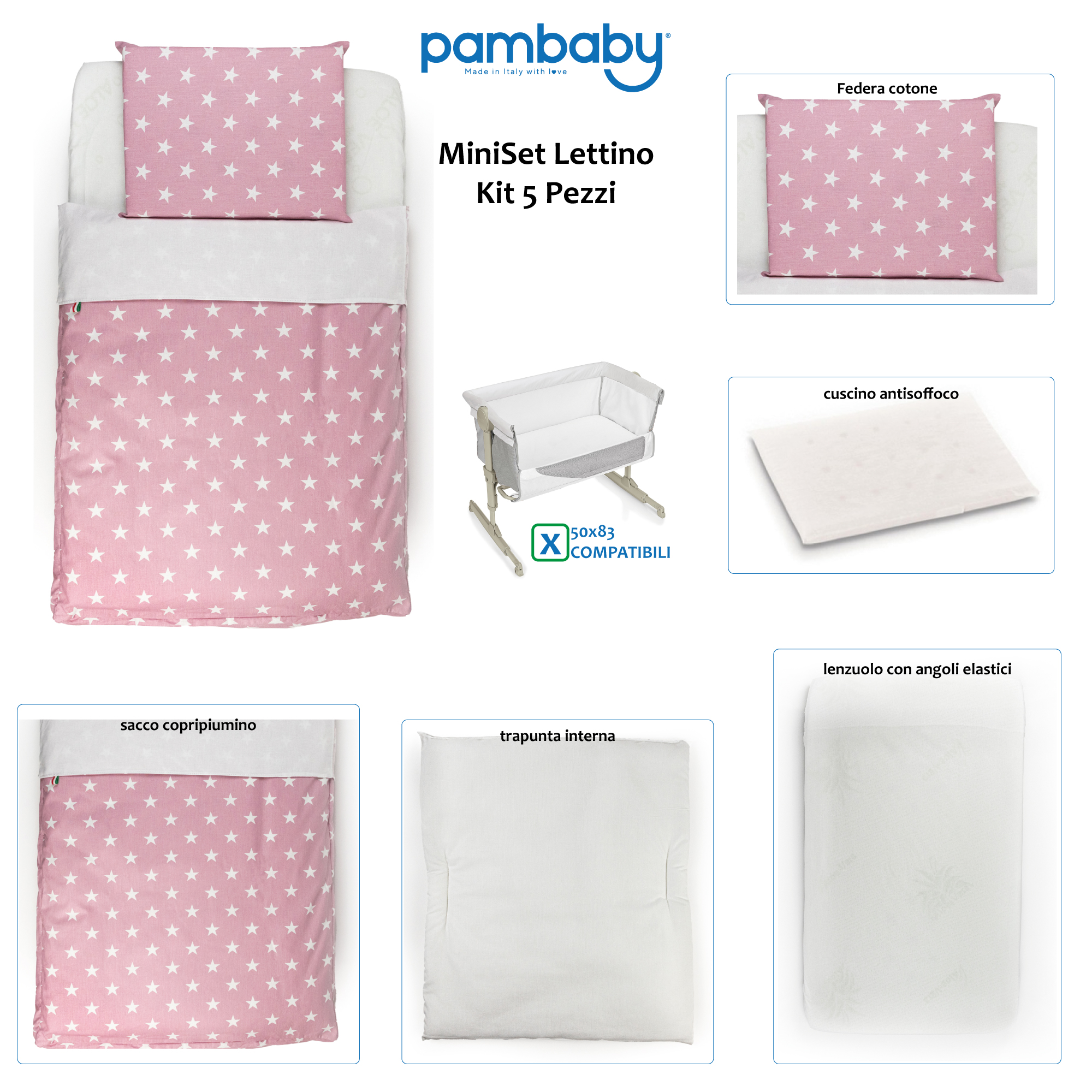 Tenero set composto da lenzuolo con angoli elastici, federa in cotone,cuscino anti soffoco e sacco copri piumino. Il set è decorato da una stampa a stelle di colore rosa.