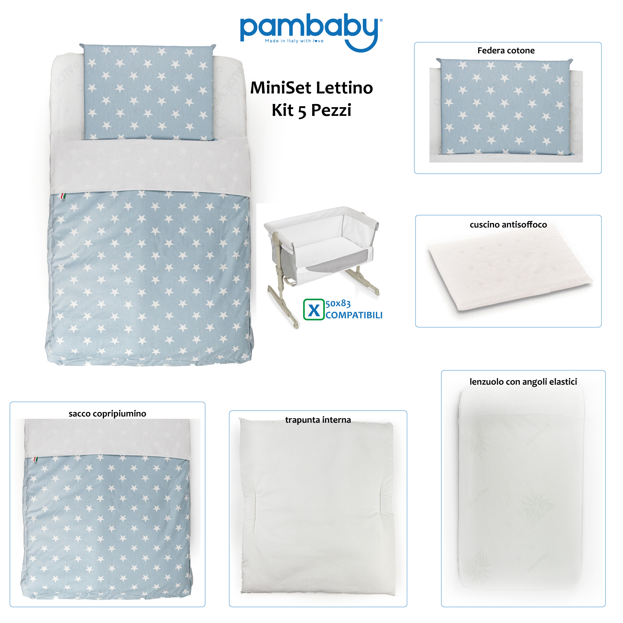 Tenero set composto da lenzuolo con angoli elastici, federa in cotone,cuscino anti soffoco, trapunta interna e sacco copri piumino. Il set è decorato da una stampa a stelle azzurra.